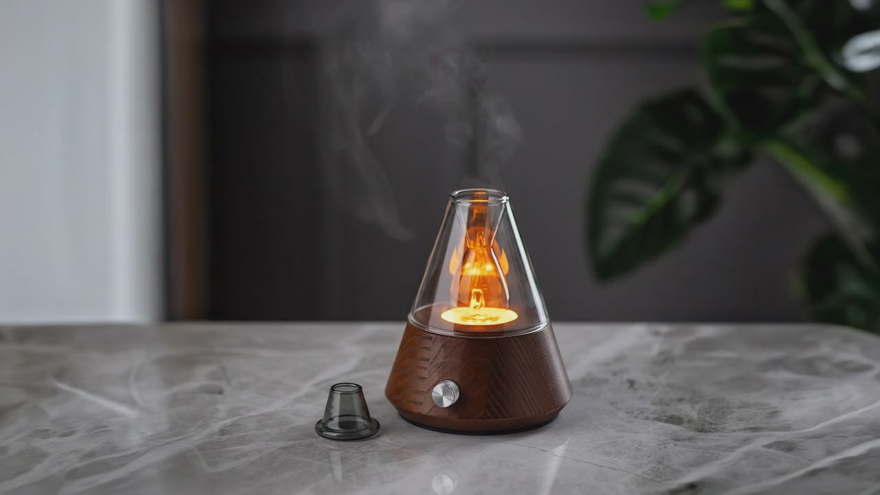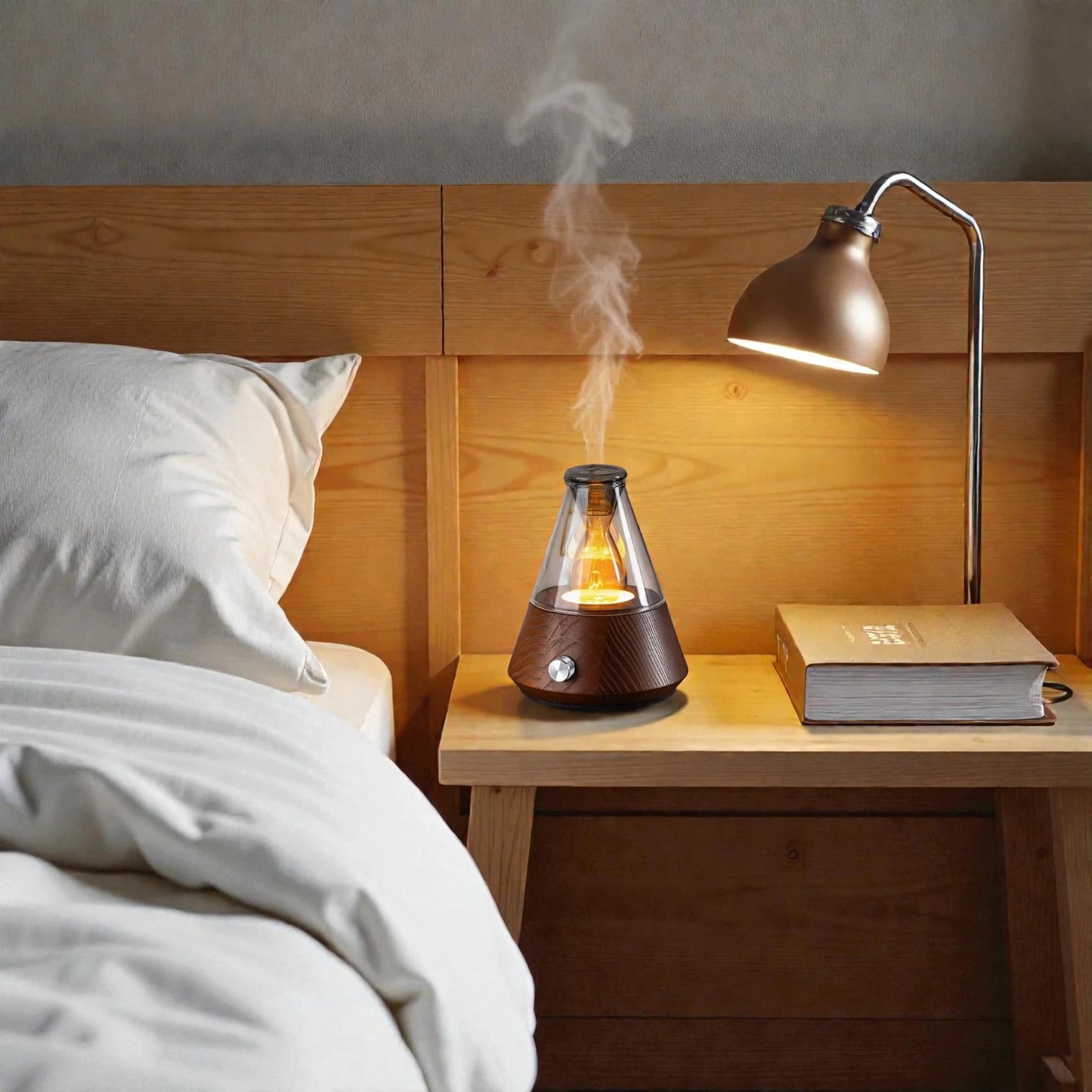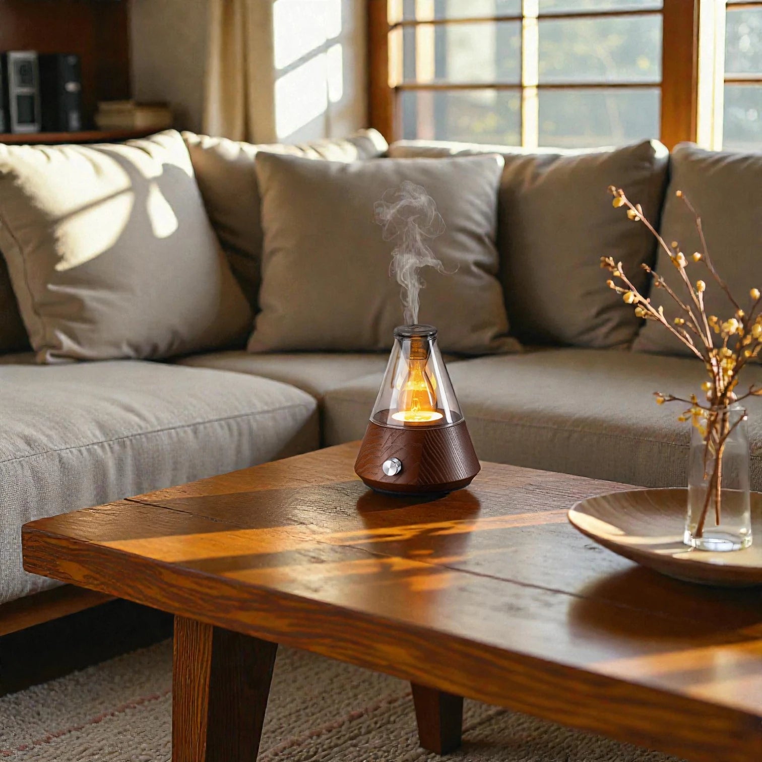 窓から射し込むやわらかな朝陽と、レトロな木目調のディフューザーが調和します。 目覚めの香りが部屋にすっと広がり、いつものリビングが、心豊かな一日を始める特別な場所へ。